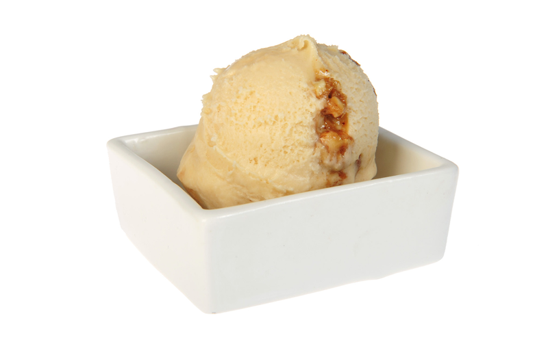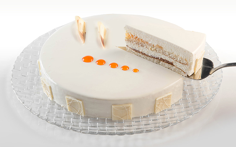 Lleugera mousse de xocolata blanca sobre planxa de pa de pessic i ametlla, cor de polpa de maracuia i cruixent d’avellana, glasseta blanc. 1,1kg.